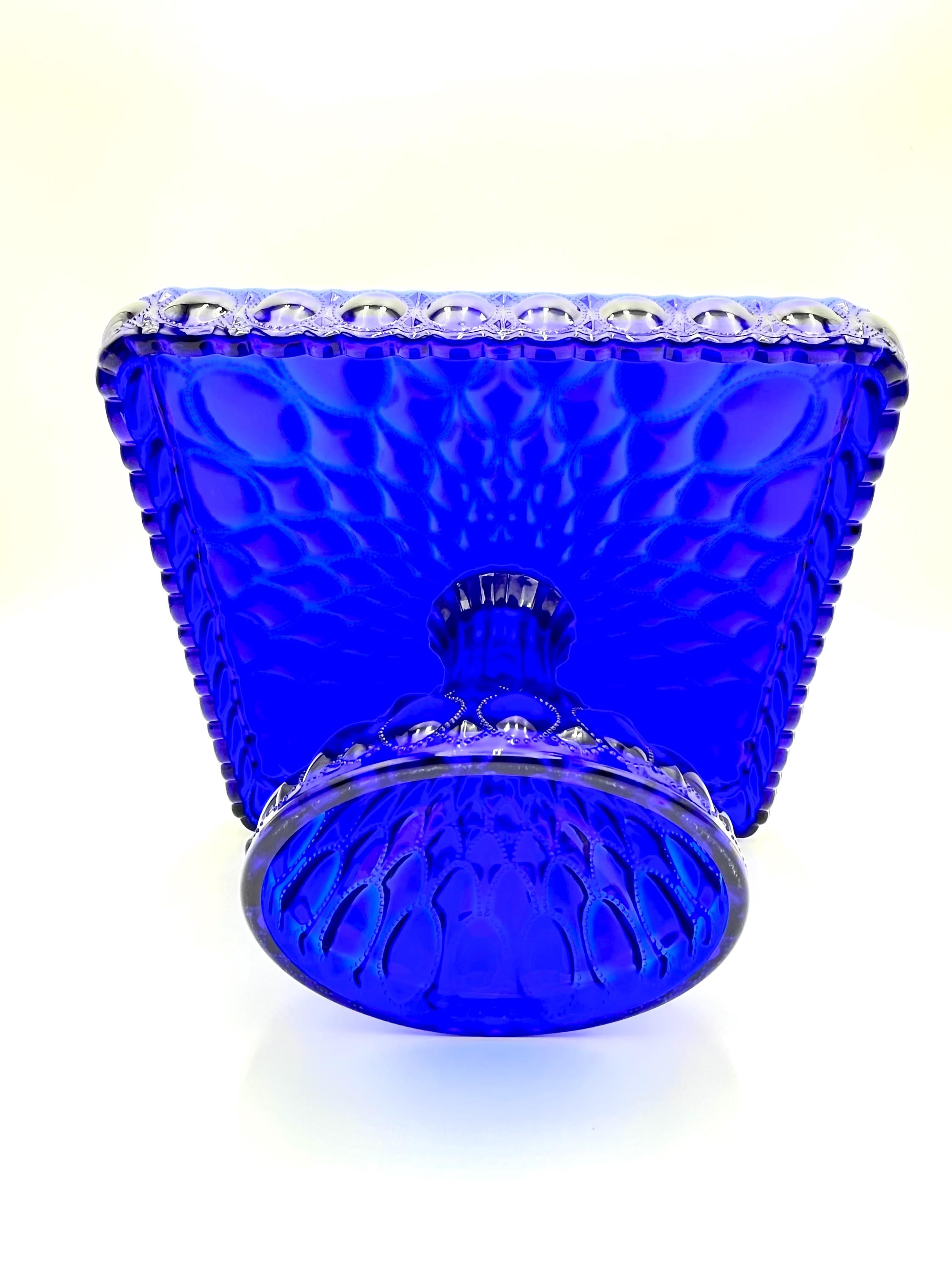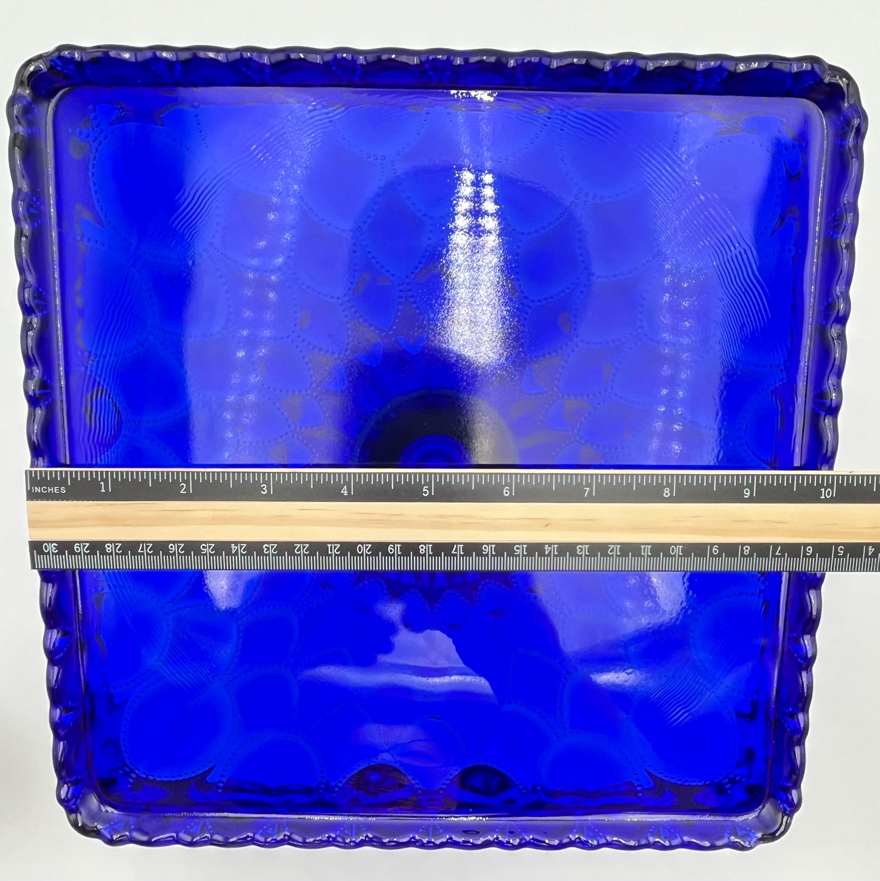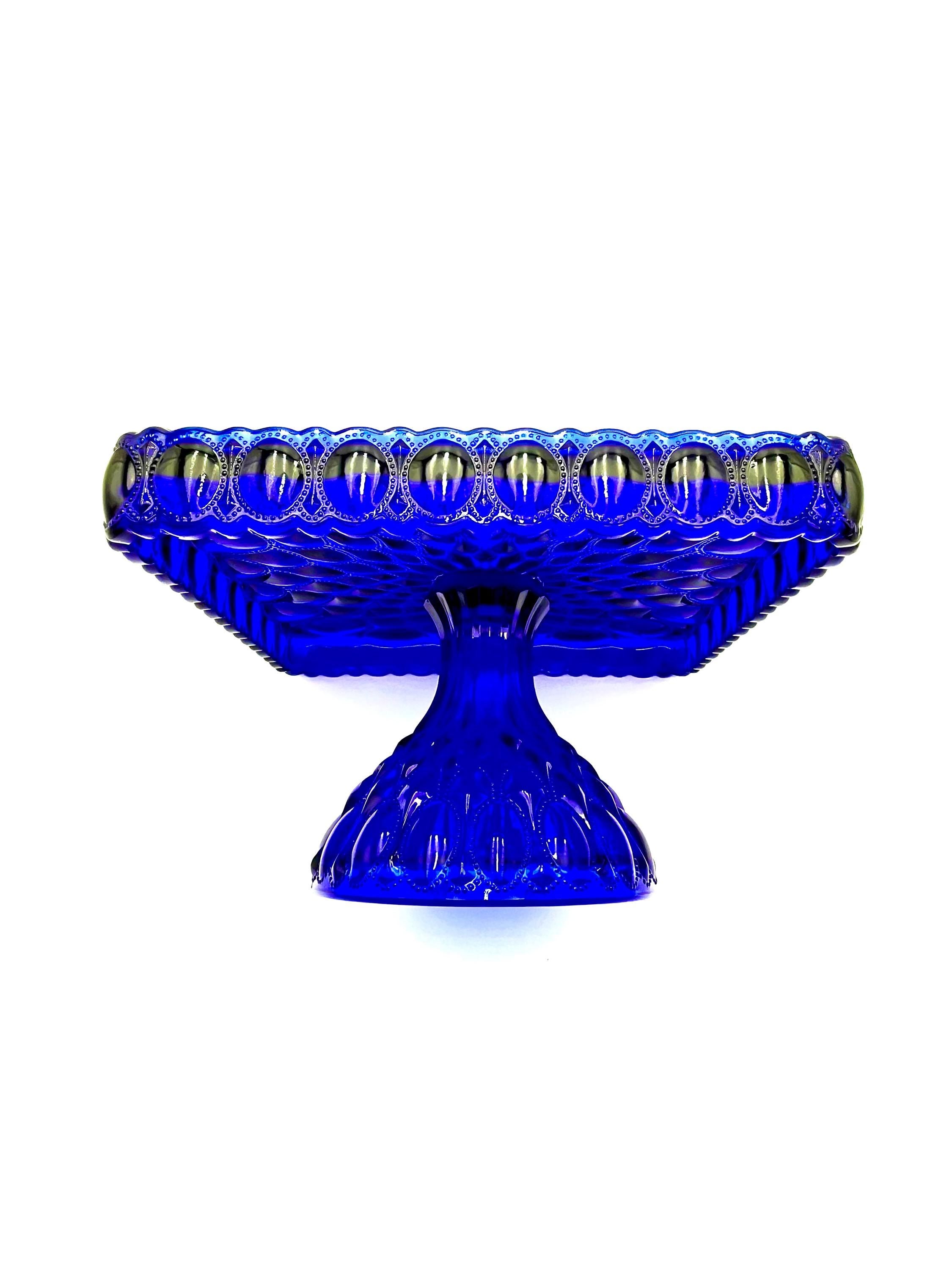 Mosser Cobalt Blue Cake Stand or Cake Plate 10" Square Elizabeth Quilted Pedestal Cake Plate by Mosser Glass. This beautiful pattern makes the event even more special! ****THESE PLATES ARE HANDMADE AND THEY VARY SLIGHTLY IN SIZE. It's approximately 10-1/4" by 10-1/4" square (the flat area is 9-3/8 by 9-3/8) and 6-1/8" high. They are simply beautiful and make the perfect base for a wedding cake, a centerpiece for chocolates, desserts, a tower of fruit, or a floral centerpiece.