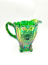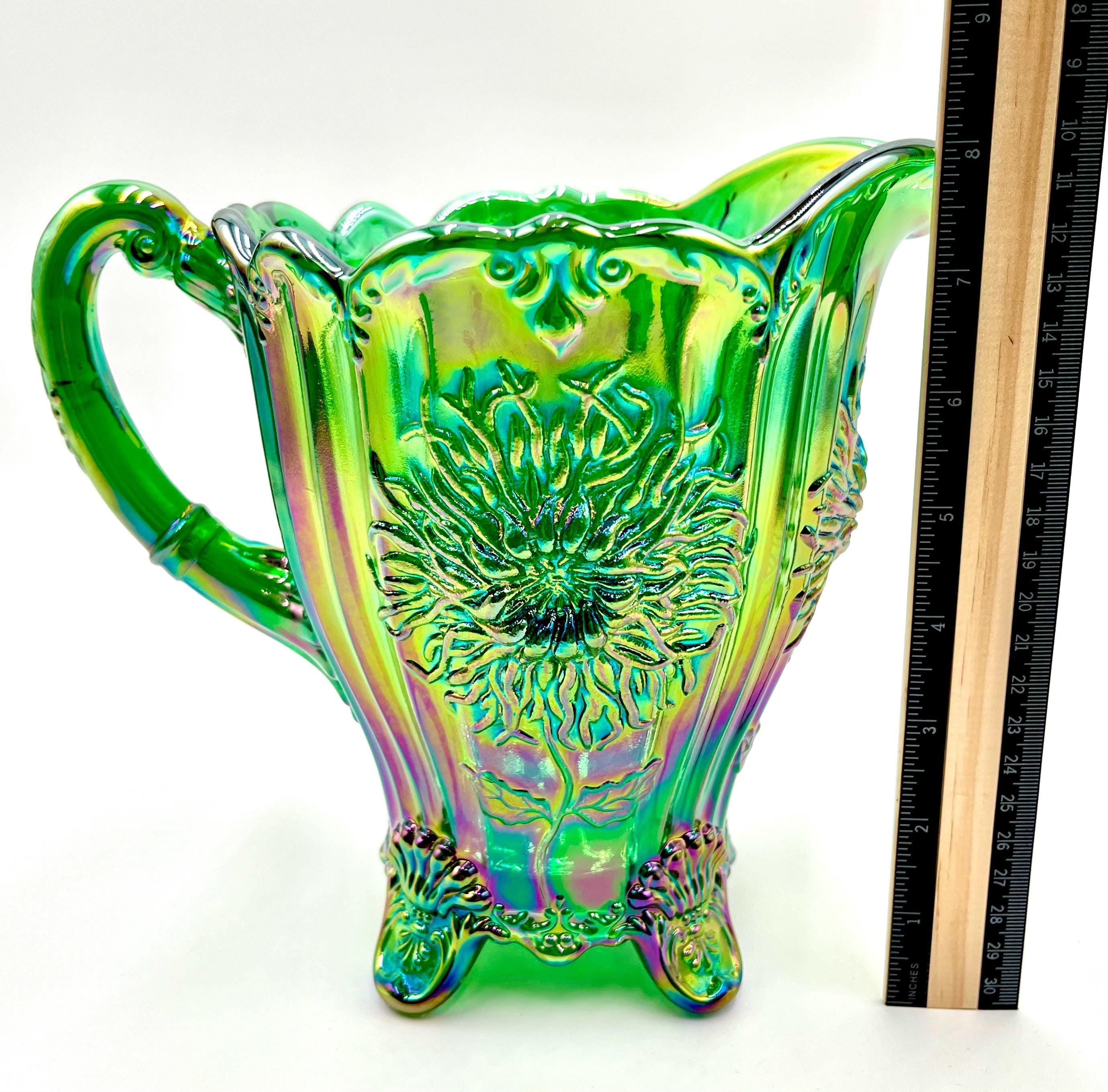 Mosser Dahlia Hunter Green Carnival Glass Pitcher. The Pitcher is approx. 8" tall by 8 -1/2" wide, including the handle, sits on a 3-1/2" base and holds 48 ounces TO THE RIM. Email me with any questions or special requests.