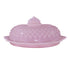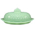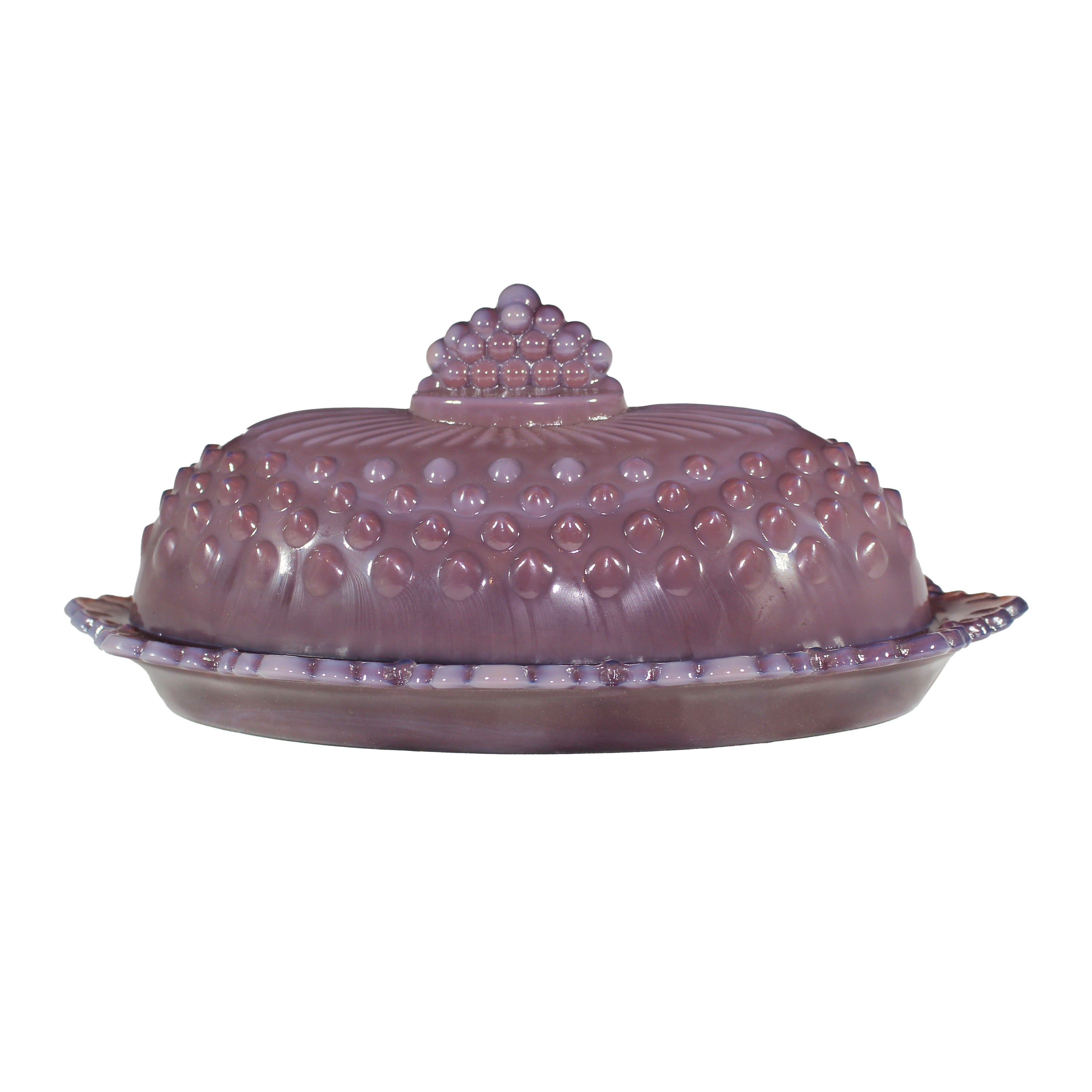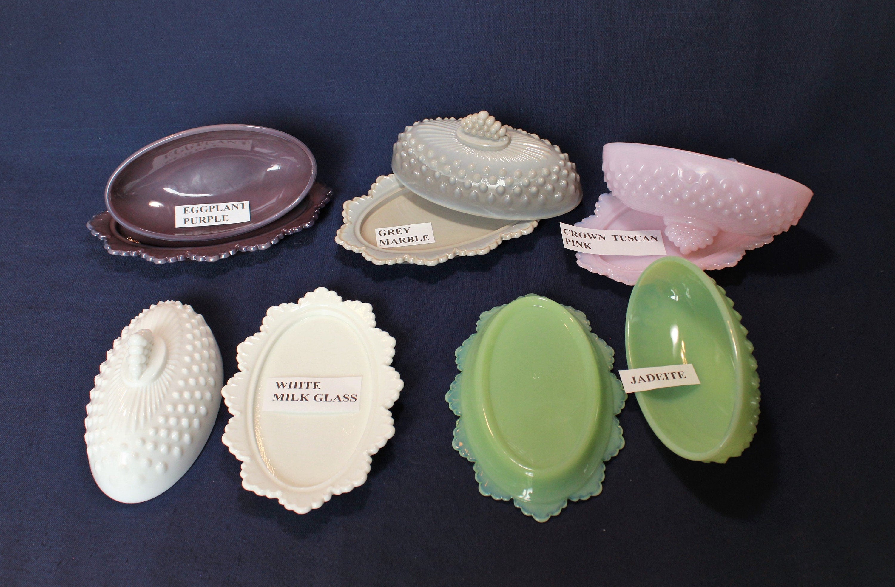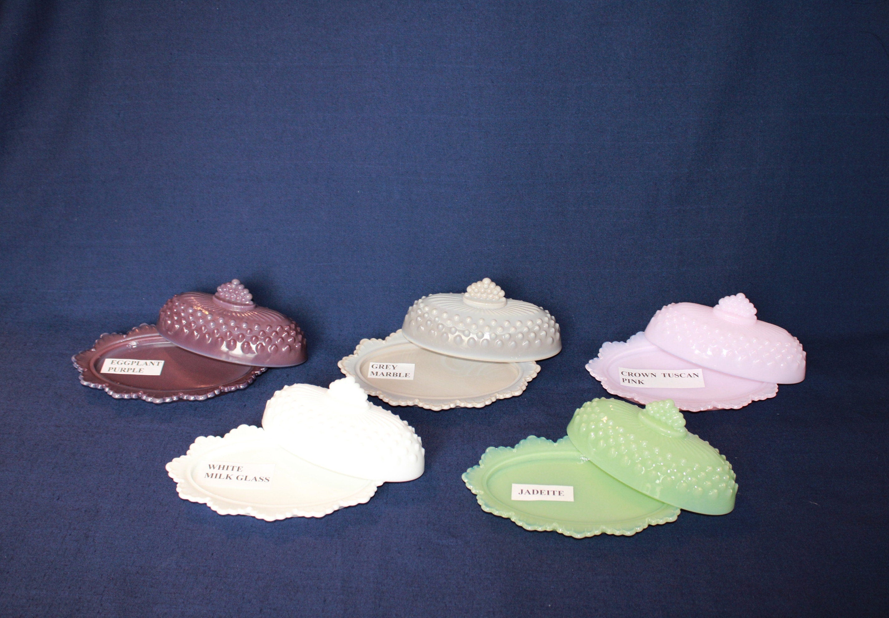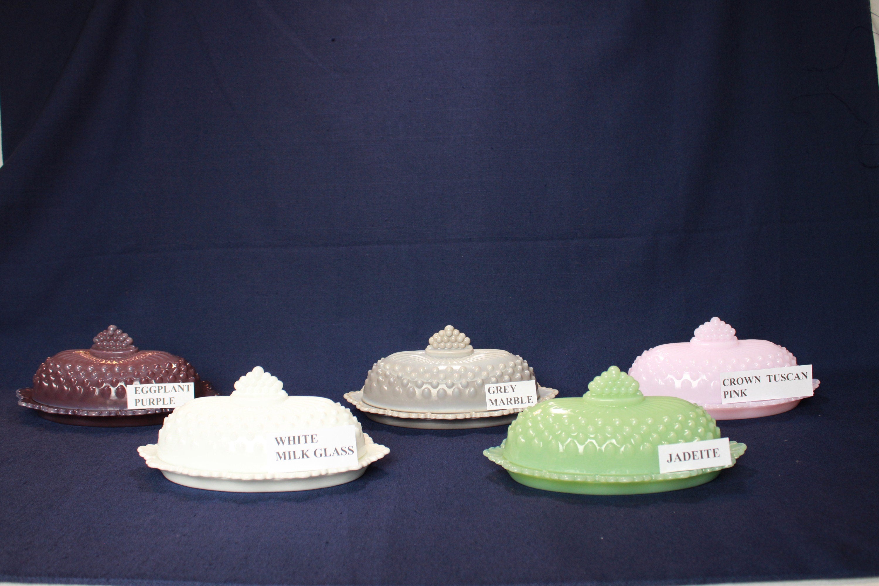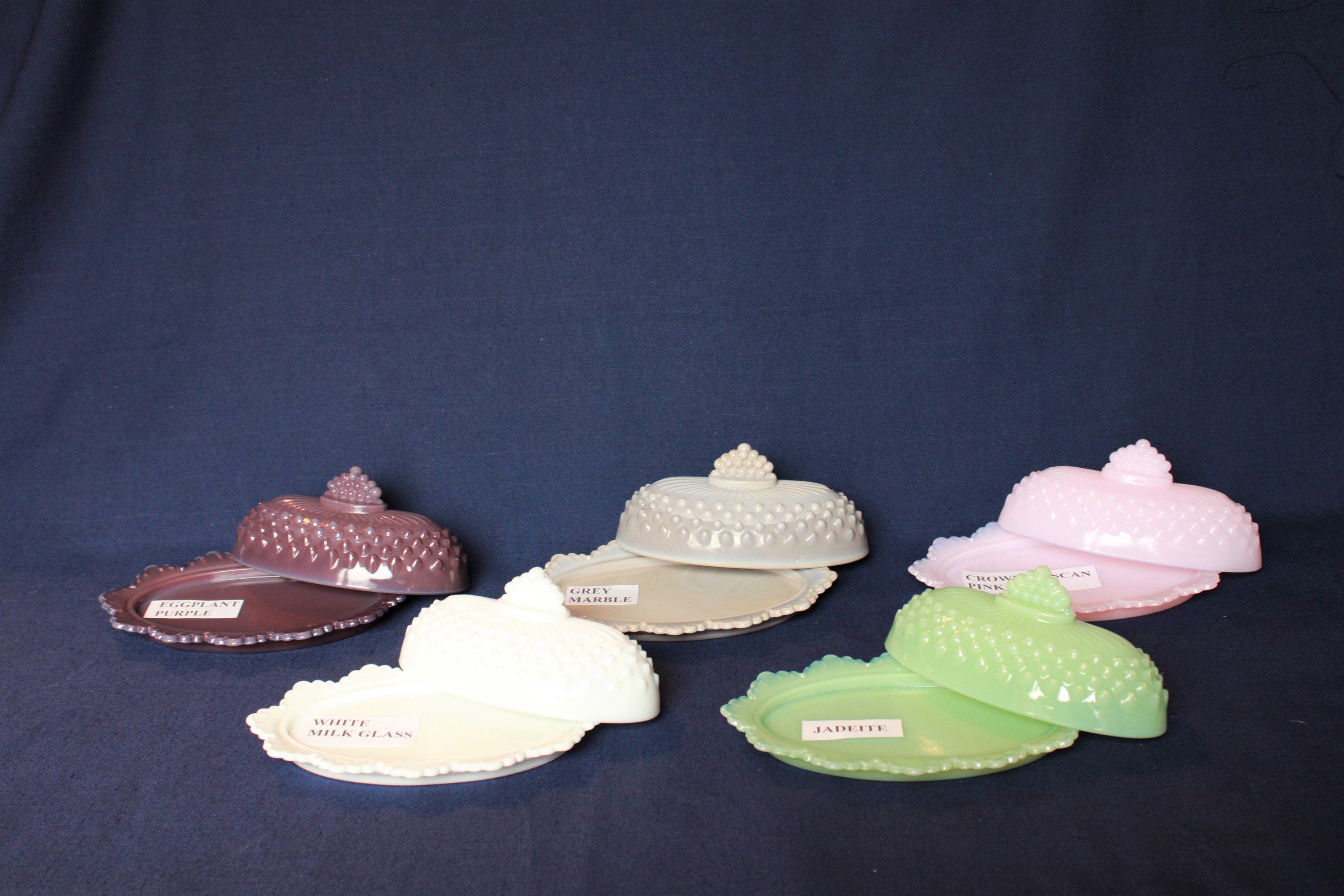 The Mosser Butter Dish is the Original Fenton Molds remade in Jadeite, Pink Crown Tuscan, Plum Purple, Grey Marble by the artists at Mosser Glass.