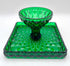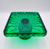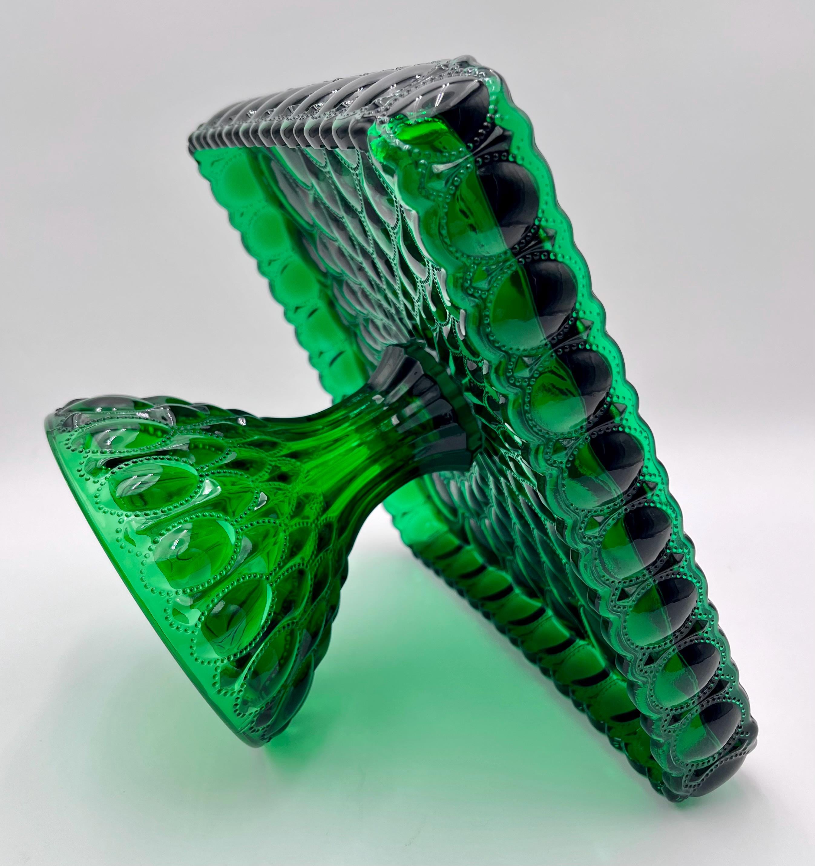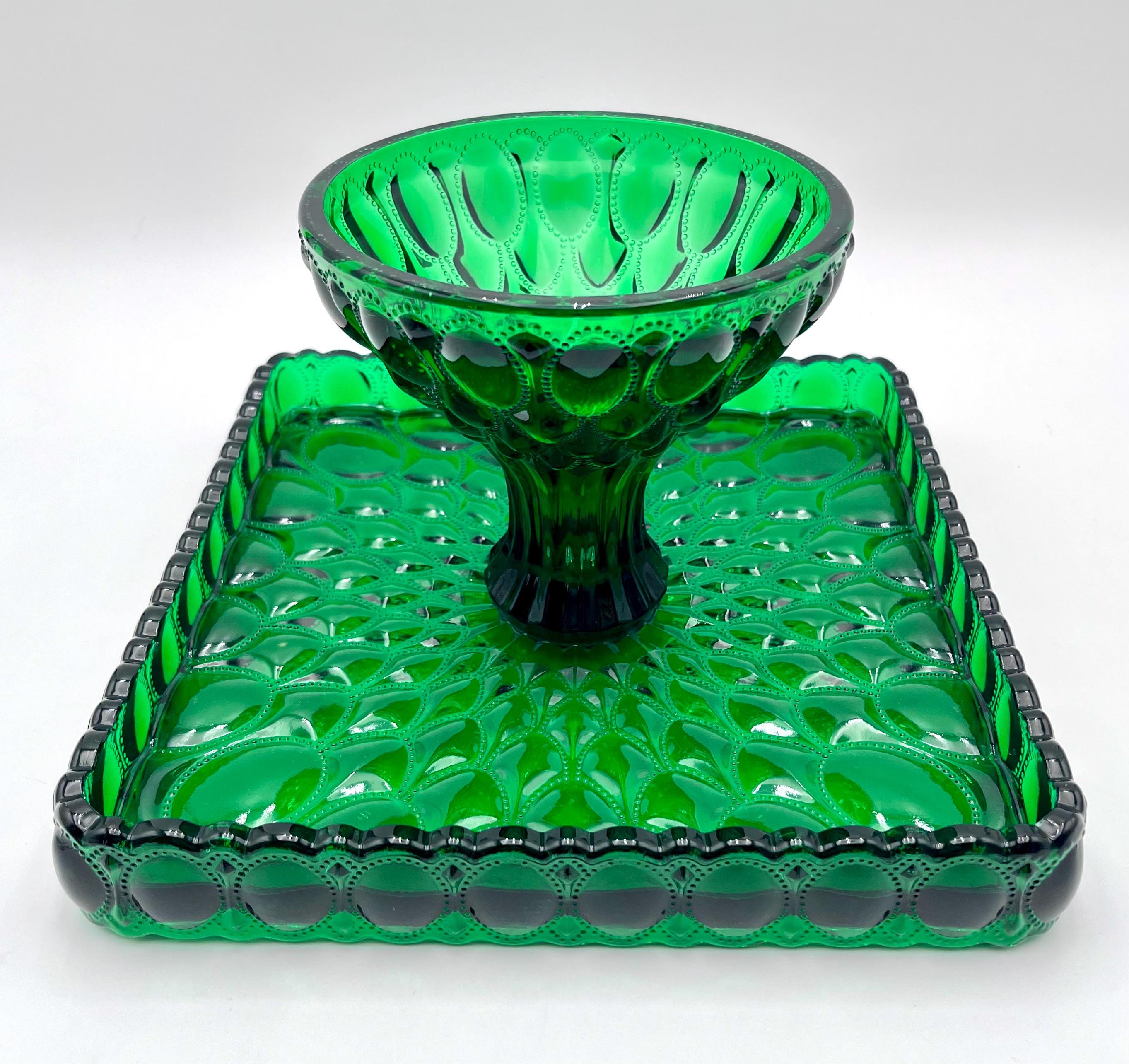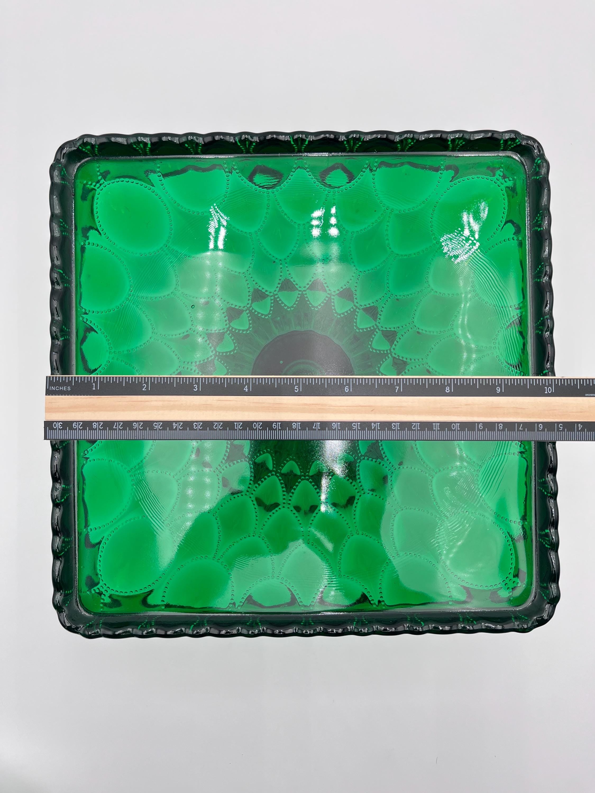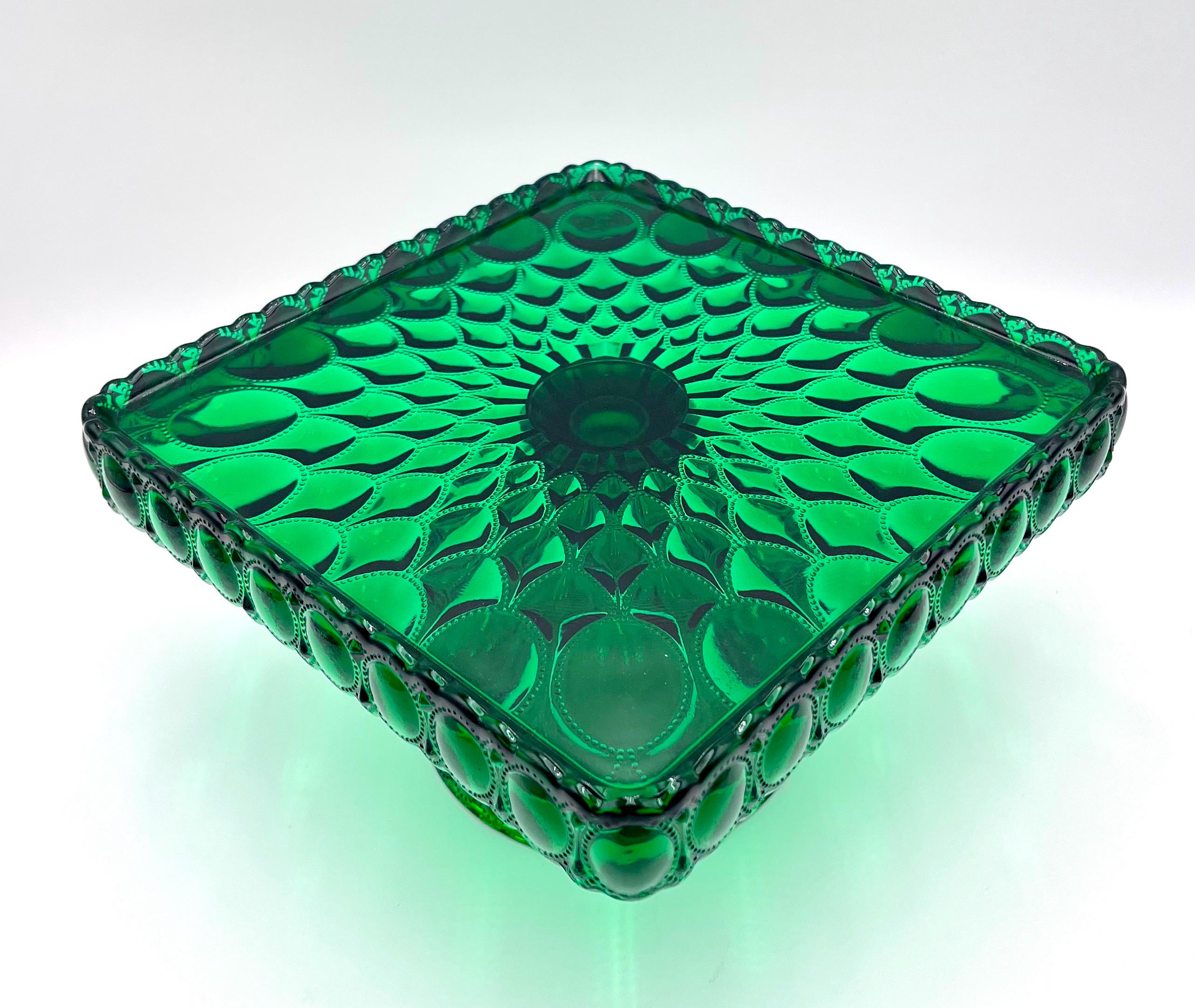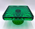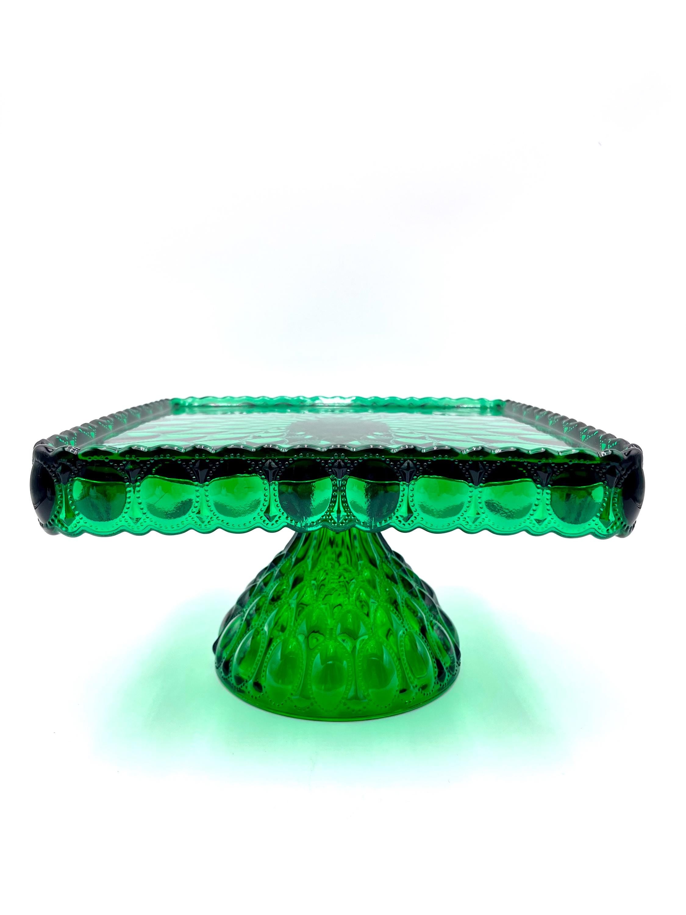 Mosser Hunter Green Cake Stand or Cake Plate 10" Square Elizabeth Quilted Pedestal Cake Plate by Mosser Glass. This beautiful pattern makes the event even more special! ****THESE PLATES ARE HANDMADE AND THEY VARY SLIGHTLY IN SIZE. It's approximately 10-1/4" by 10-1/4" square (the flat area is 9-3/8 by 9-3/8) and 6-1/8" high. They are simply beautiful and make the perfect base for a wedding cake, a centerpiece for chocolates, desserts, a tower of fruit, or a floral centerpiece.