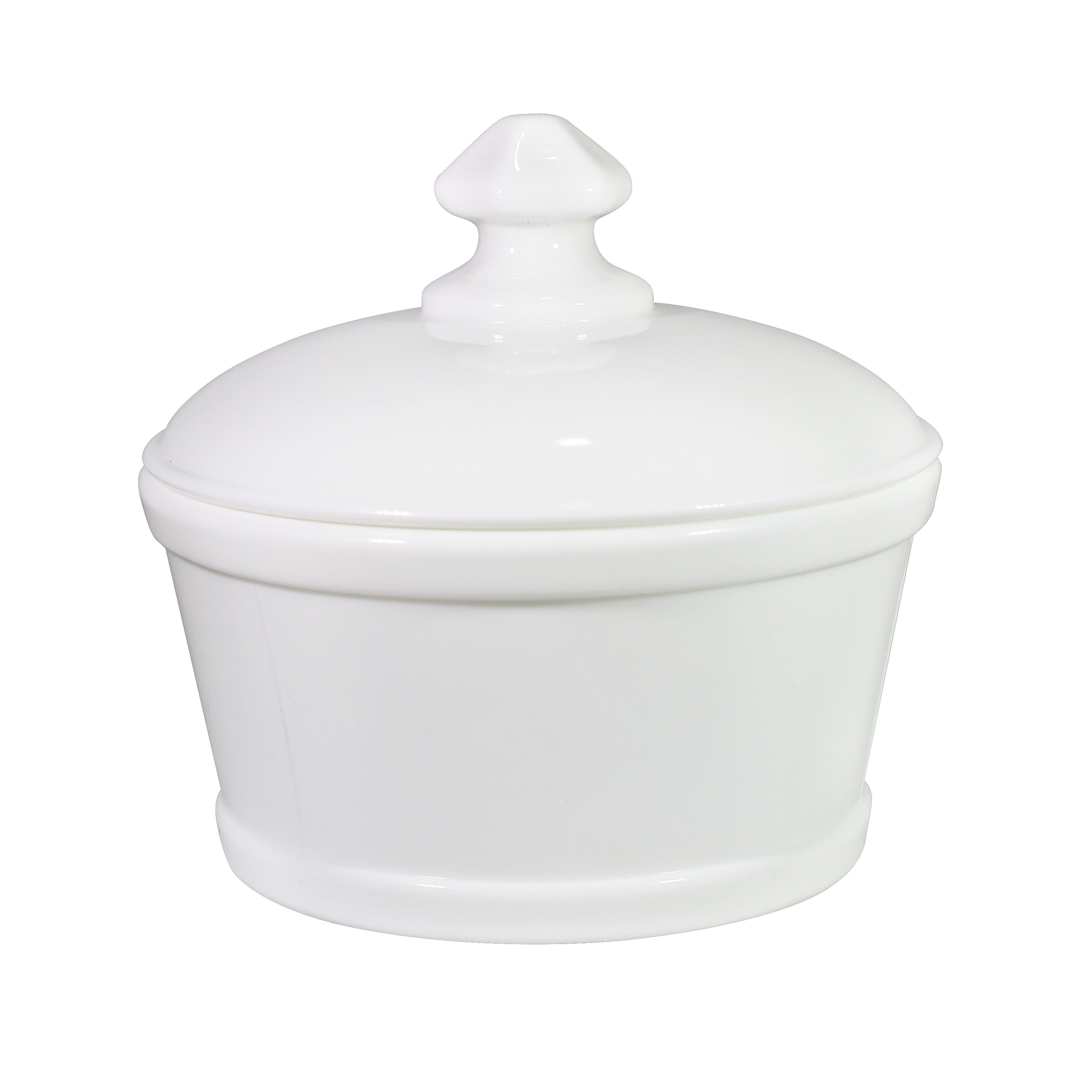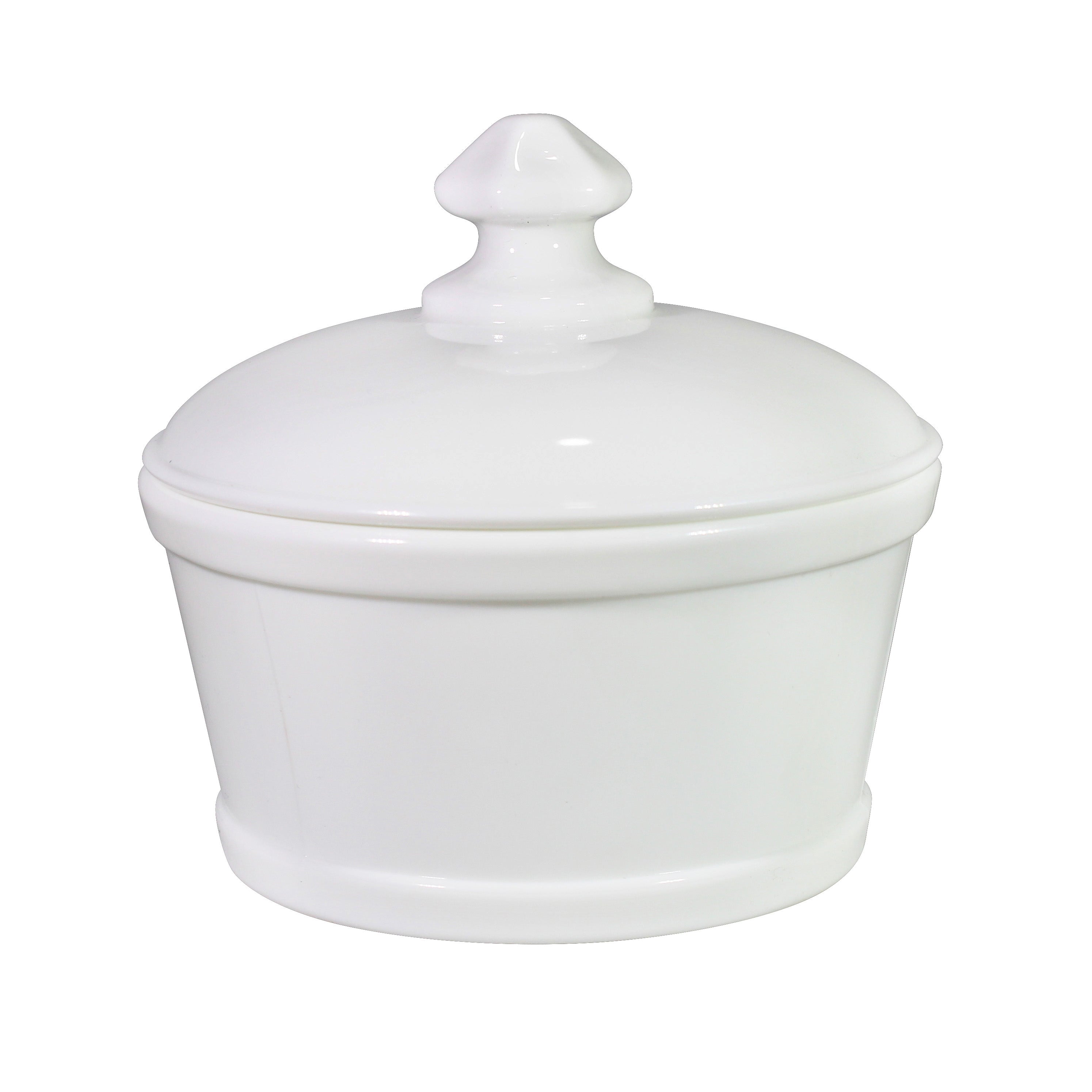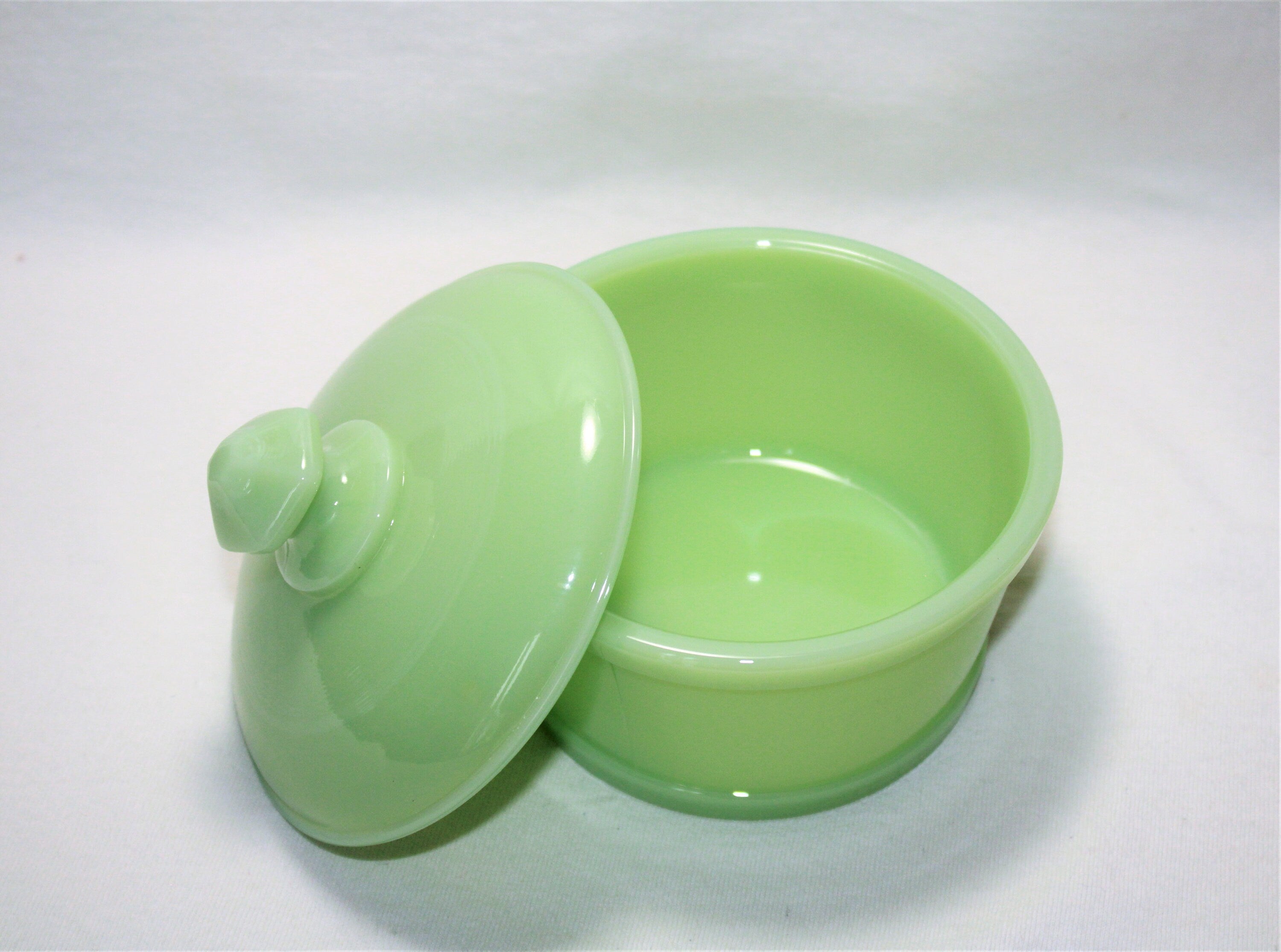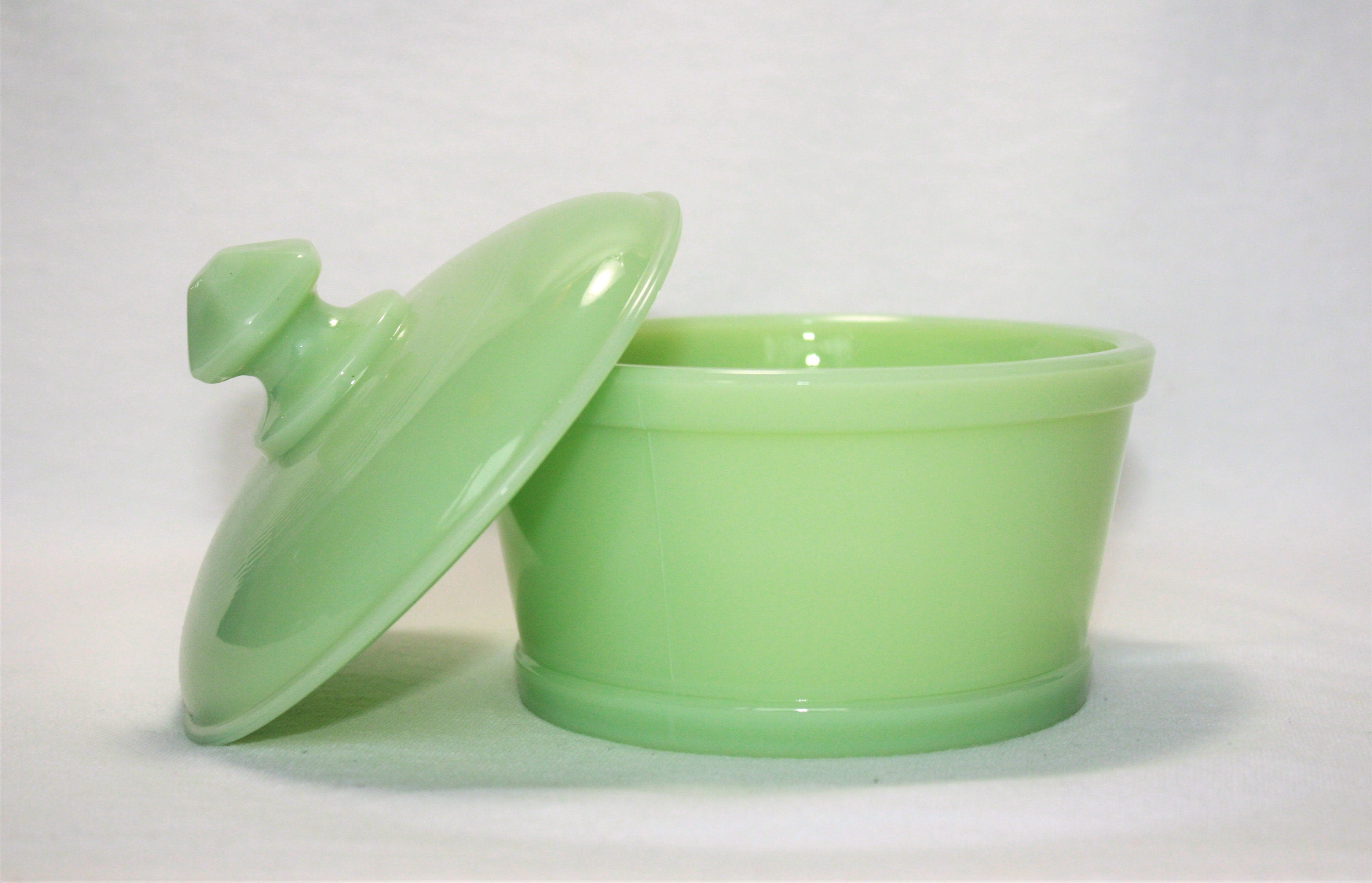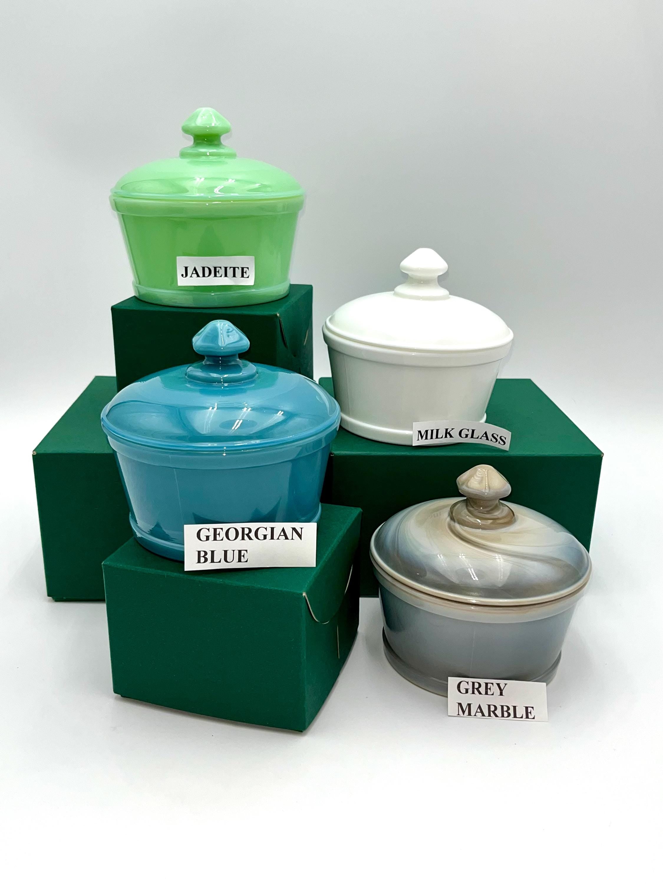 Mosser Butter Dish, YOUR Choice of Color: Jadeite, Milk Glass, Grey Marble, or Georgian Blue. These beautiful Butter Tubs by Mosser Glass measure 4-3/4" Wide by 4-3/8" High. Go from refrigerator to the table in this farmhouse-style butter tub. This is also a great size for dips, jams, and sugar bowl!