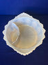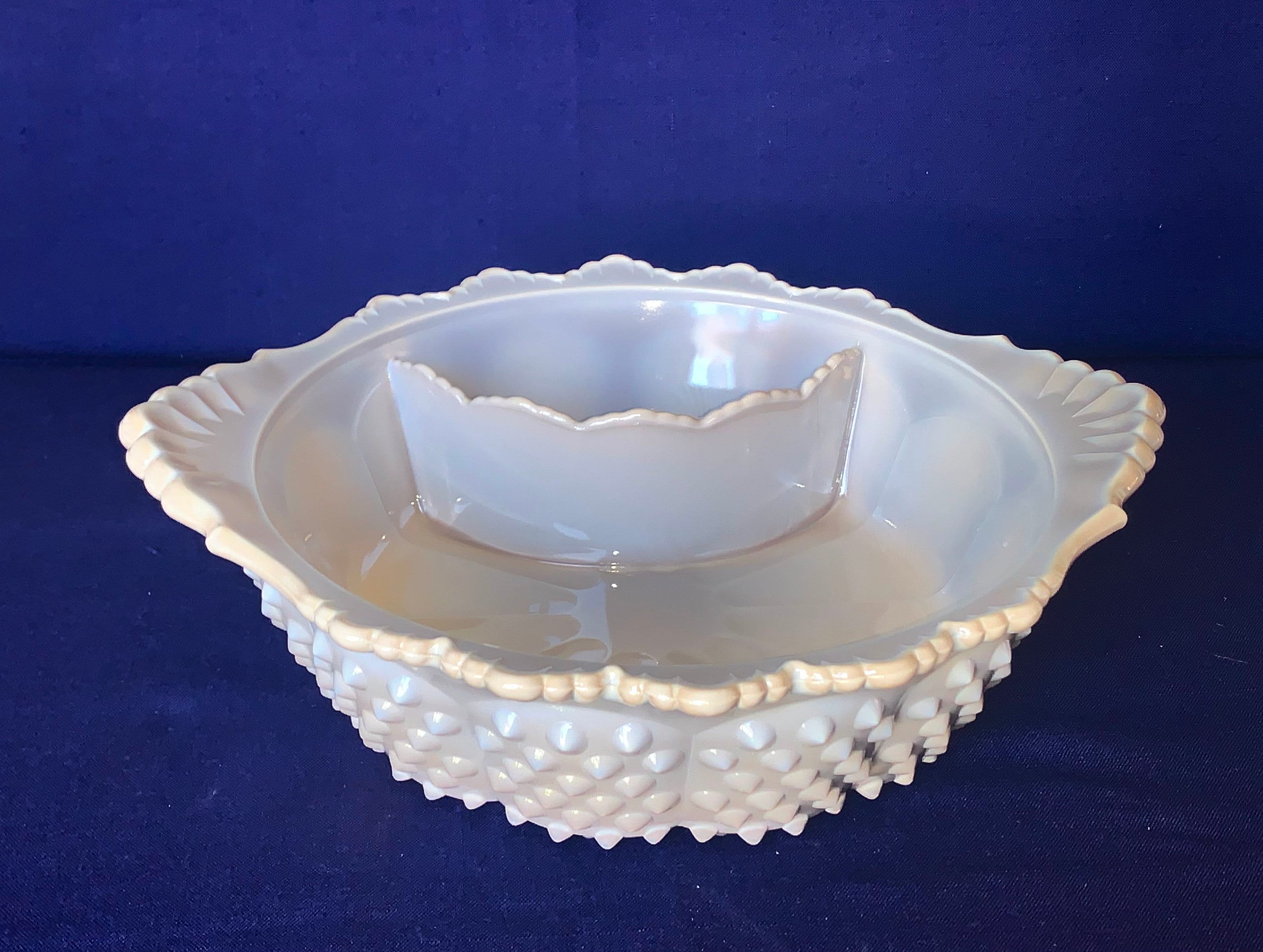 MOSSER GLASS GREY CHIP & DIP BOWL, this Grey Marble Bowl measures approx. 3 1/2" high by 12 3/8" wide. This is also the perfect vegetable and dip, shrimp and cocktail sauce, the size and divided side makes it multifunctional. This is new and in perfect condition, these timeless beauties are beautiful and useful. Original Vintage Molds remade in Jadeite by the artists at Mosser Glass.