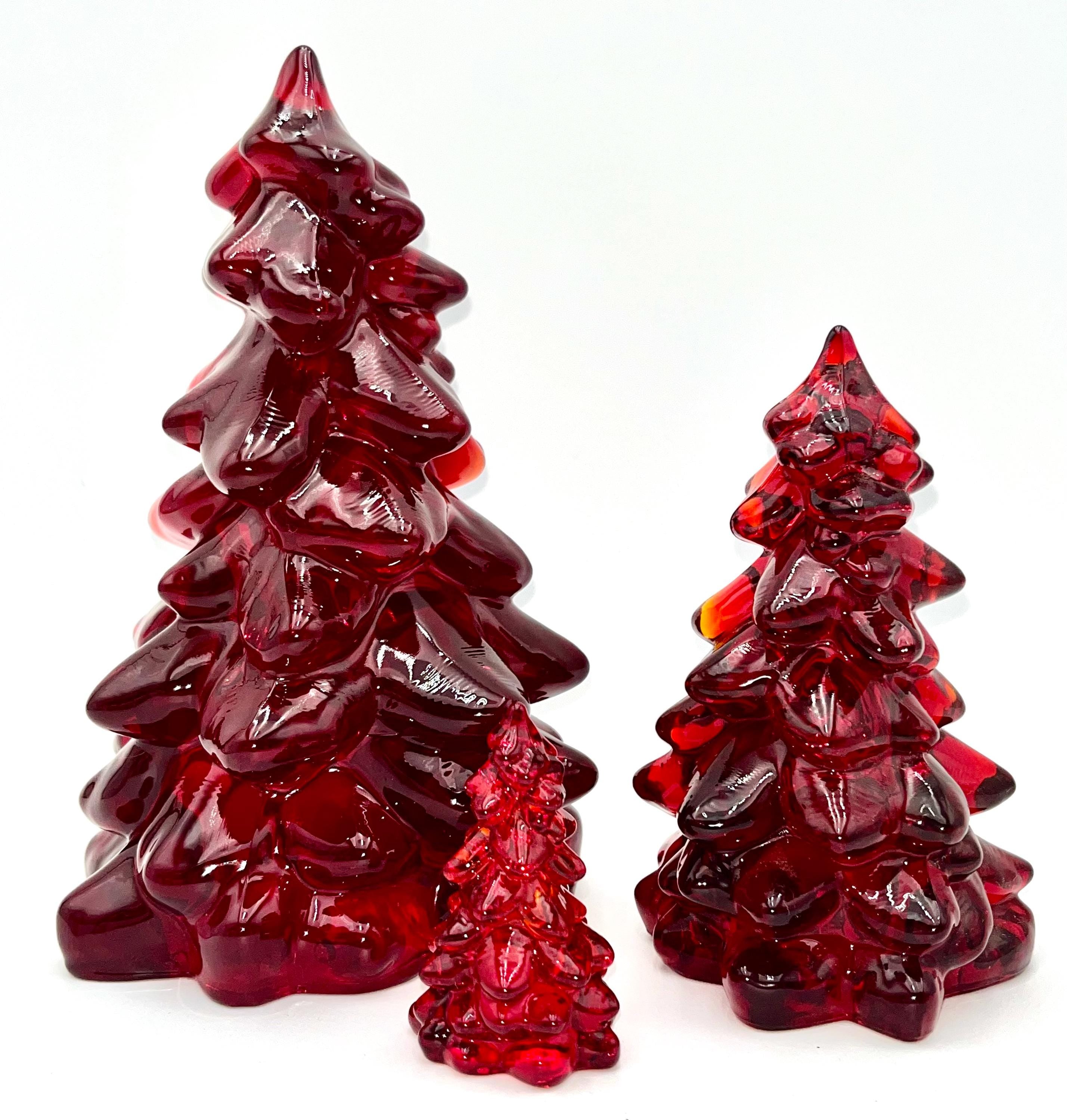Mosser Red Trees Set of 3 Trees, one of each 8" Tree, 5-1/2" and 2-3/4" Original Vintage Molds remade by the artists at Mosser Glass.